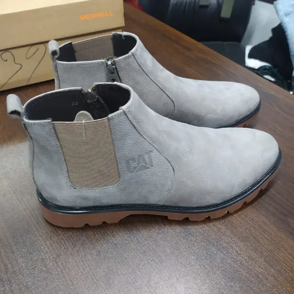 These CAT ankle boots blend the rugged durability of a work boot with the sleek silhouette of a Chelsea boot. Crafted from high-quality grey nubuck leather, they feature a unique hybrid closure system for both style and easy wear.